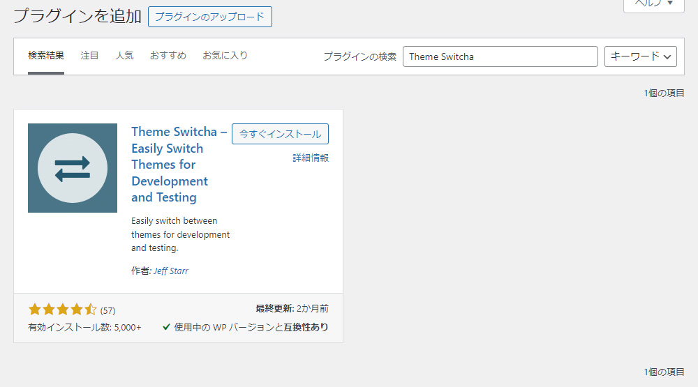 管理画面の「プラグイン > 新規プラグインを追加」と進み、「Theme Switcha」を検索します。