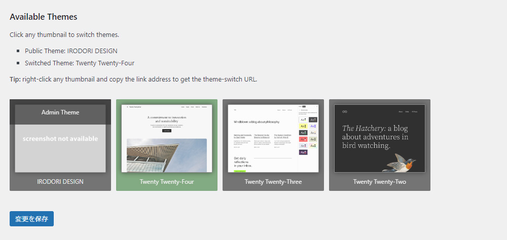 設定画面を開き、画像赤枠の「Enable theme switching」にチェックを入れ、「変更を保存」をクリックします。このチェックを入れることでテーマ切り替え機能が使えるようになります。